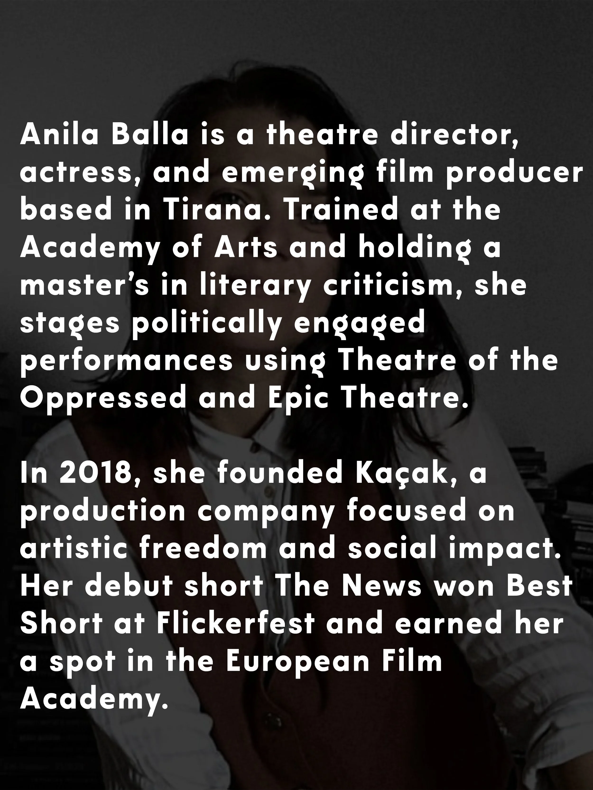GLOBAL PRODUCTION COMPANY. FOUNDED IN TIRANA IN 2025, NOW CREATING EVERYWHERE. WE'RE ALL ABOUT GREAT STORIES, DRIVEN FILMMAKERS, AND MOST IMPORTANTLY, YOU. OUR TEAM Arsid Rraboshta Founder/CEO Founder/CEO Elly Senger-Weiss Founder Altea Rraboshta Manager Anila Balla